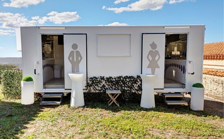 Los remolques de baños portátiles de lujo son la mejor opción para bodas exclusivas al aire libre. Ofrecen diseño cuidado, mayor confort y una experiencia premium. Son completamente autónomos, no necesita ninguna conexión.